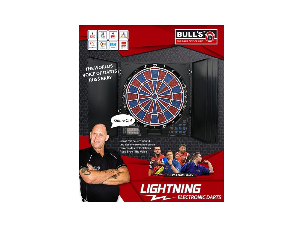 Elektronický terč Bull’s Lightning s hlasem legendárního Russa Braye. Elegantní kabinet, LED displeje a herní režimy pro 1–8 hráčů dělají z tohoto terče ideální volbu pro domácí zábavu.
