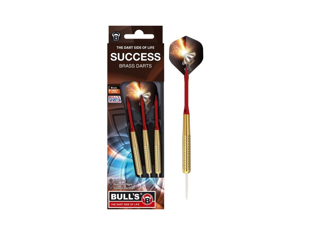 Bull’s Success steel jsou mosazné šipky ideální pro začátečníky. Nabízí dobré vyvážení, stabilní let a pohodlný úchop při hře. Součástí balení je praktické pouzdro Bull’s Cone Case
