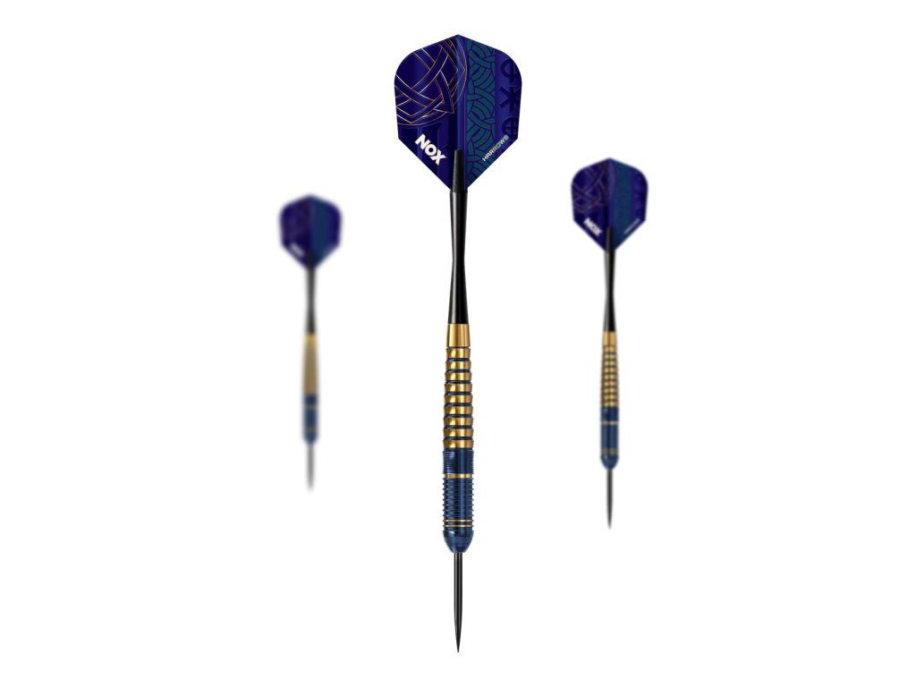 Harrows Nox Premium Brass Steeldarts jsou klasické ocelové šipky s mosaznými hlavněmi a výrazným dvoubarevným designem v královské modré a zlaté. Ideální pro hraní na klasické steel terče.